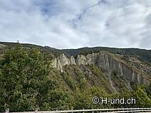 Più avanti vediamo le piramidi ancora un paio di volte dall'alto. La nostra escursione termina a Hérémence, un grazioso villaggio con una chiesa speciale e molte case di legno.