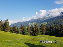 Questa mattina alle 9.10 tutte le nostre cose sono imballate e partiamo sotto il sole e le nuvole per la nostra tappa di oggi a Felsberg. Il sentiero ci porta all'inizio attraverso la foresta e i prati in leggera salita. Ancora e ancora possiamo ammirare le belle viste dell'altro lato della valle di Schanfigg. Attraverso il primo prato seguiamo un sentiero difficilmente riconoscibile, solo i marcatori bianchi e rossi ci indicano la strada. Su per la foresta raggiungiamo un pascolo di mucche, che dobbiamo attraversare. Mia non è a suo agio con questa situazione e abbaia alle mucche. Qui incontriamo anche Tim, un candidato di Bauer ledig sucht del 2016, che ci fa notare che con un cane che abbaia dobbiamo stare alla larga dalle mucche sdraiate per non disturbarle. Normalmente lo facciamo, ma poiché l'uscita del pascolo è proprio accanto alle mucche, non è possibile.